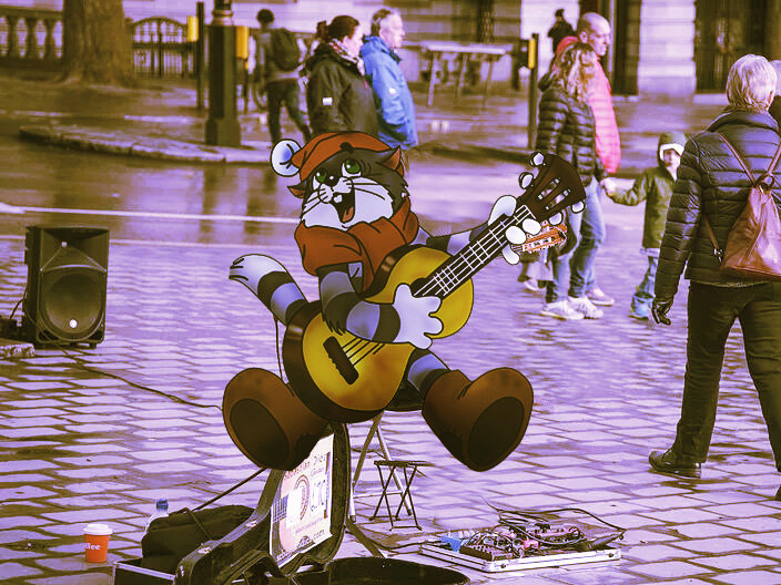 1. На первой фотографии Кот Матроскин изображен в виде уличного музыканта с гитарой, он распевает веселые песни, пытаясь привлечь к себе внимание