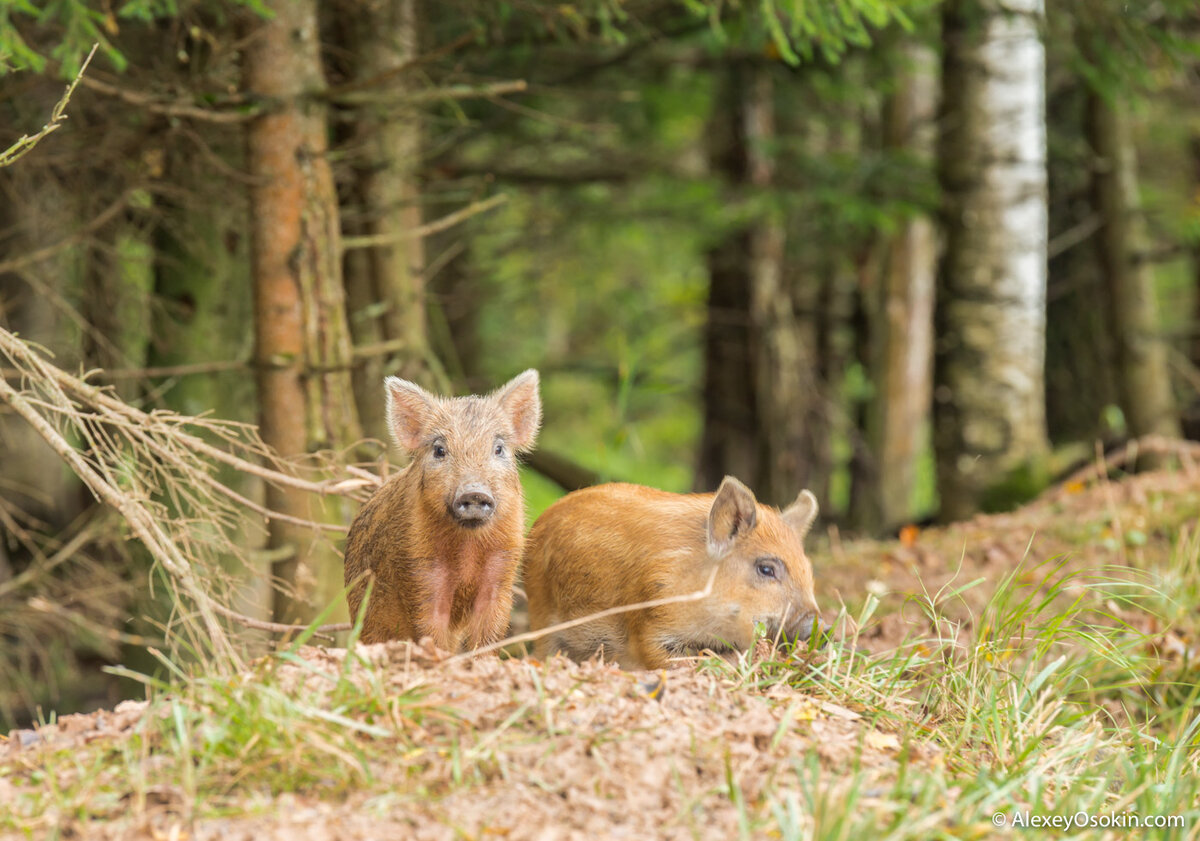 Я был абсолютно не готов, даже растерялся и, признаться, испугался от неожиданности. Ведь если здесь такая толпа поросят, то где-то рядом кабаны постарше, а они бывают очень агрессивными. Нас было много, а кабанов, как выяснилось, всего шестеро, включая четырех поросят. Звери быстро пробежали, но забравшись на небольшой холмик, остановились и уставились на нас. И я совсем не пожалел, что потащил с собой лишние пять килограмм! :)