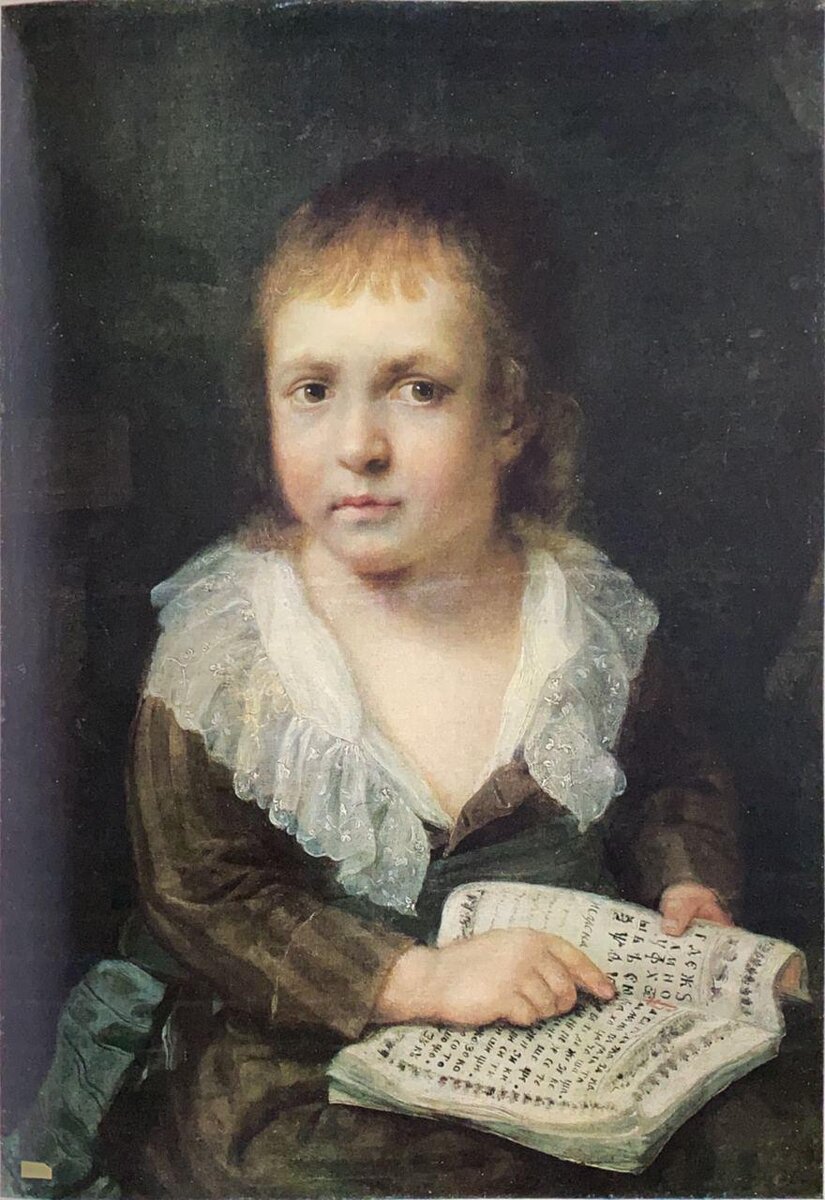 Самое интересное в этом детском портрете, на мой взгляд, это что ребенок читает Азбуку и ребенку этому - три года. Графский сын Иван Алексеевич Мусин-Пушкин написан неизвестным художником ярославской школы около 1786 года.
