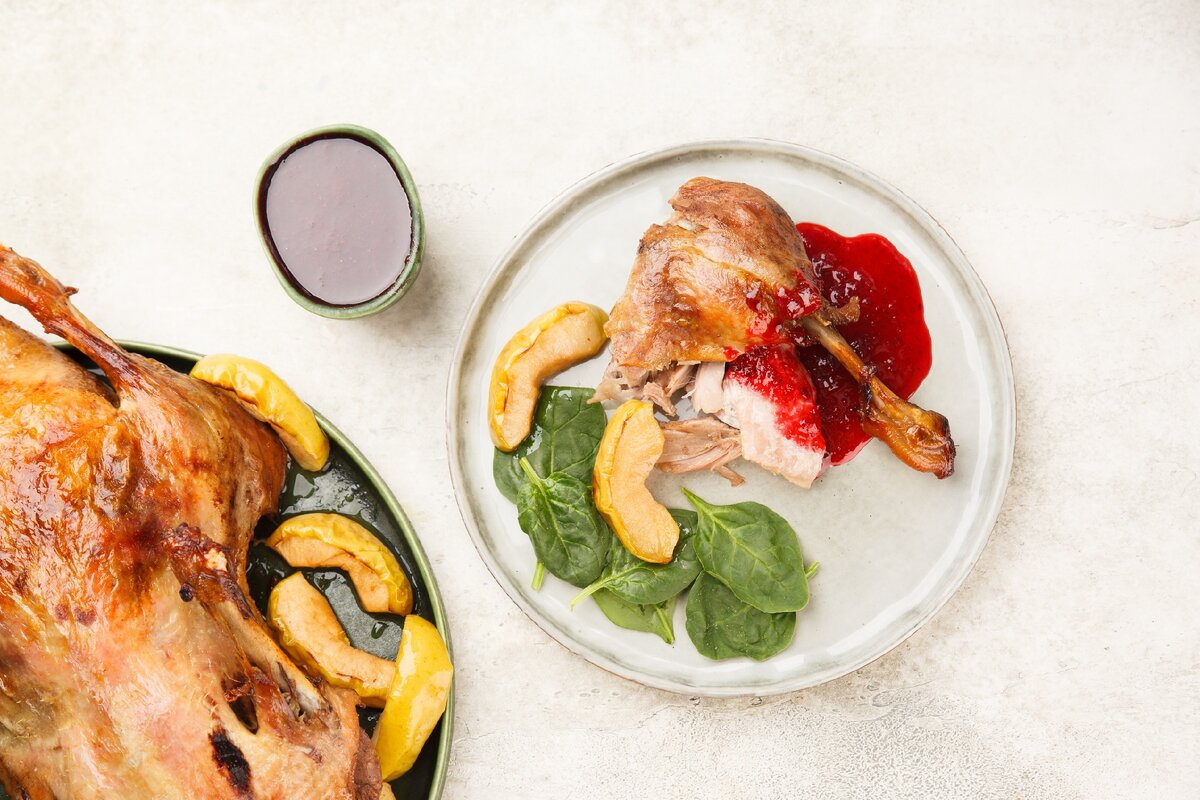 Подавайте утку с протёртой клюквой и салатом из свежей зелени.