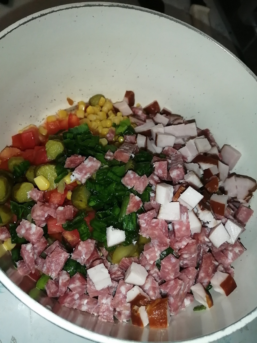 1. Нарезать колбасу, перец, помидоры, огурцы и зелень. Старайтесь резать одного размера и формы