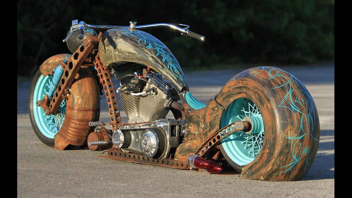 В частности все это движение зародилось в Мексике. Там переделывали огромные байки, вообщем большие дядьки разукрашивали свои игрушки. Огромные передние колеса и обвесы были их главным отличием.