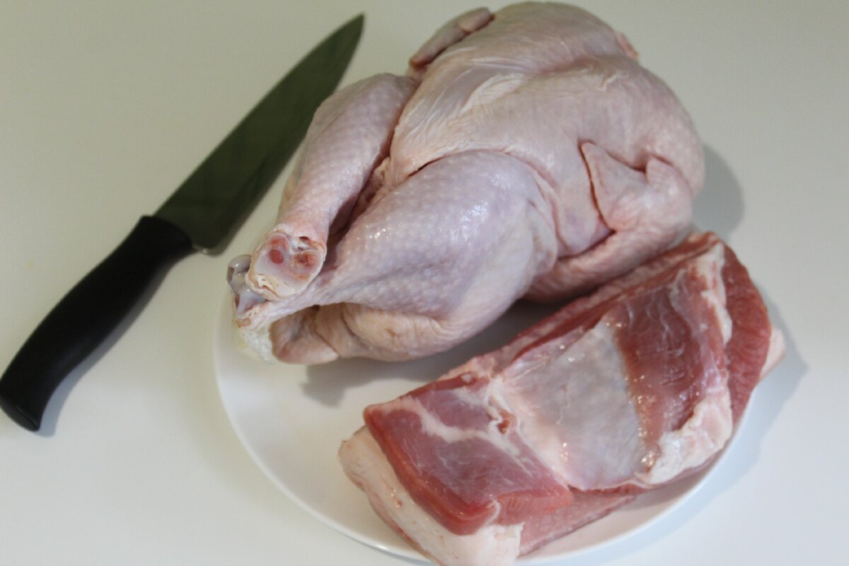 Для приготовления фарша для домашних колбасок я беру одну целую курицу, килограмма на два. И еще, грамм 700 хорошей свиной грудинки, чтобы фарш не был слишком сухим.