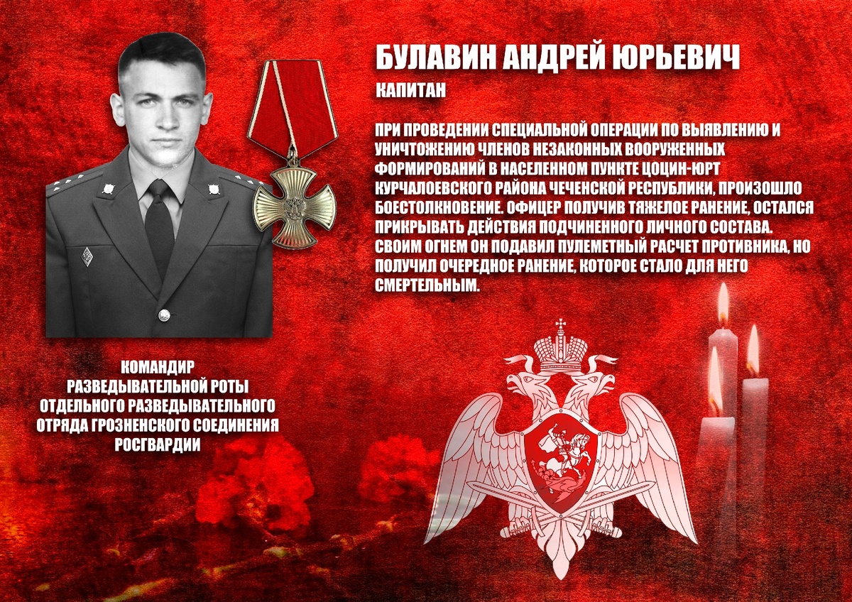 В списки личного состава отдельной ордена Жукова бригады оперативного назначения Северо-Кавказского округа Росгвардии навечно зачислен командир разведывательной роты отдельного разведывательного отряда внутренних войск МВД России капитан Андрей Булавин, героически погибший при выполнении воинского долга девятнадцать лет назад.