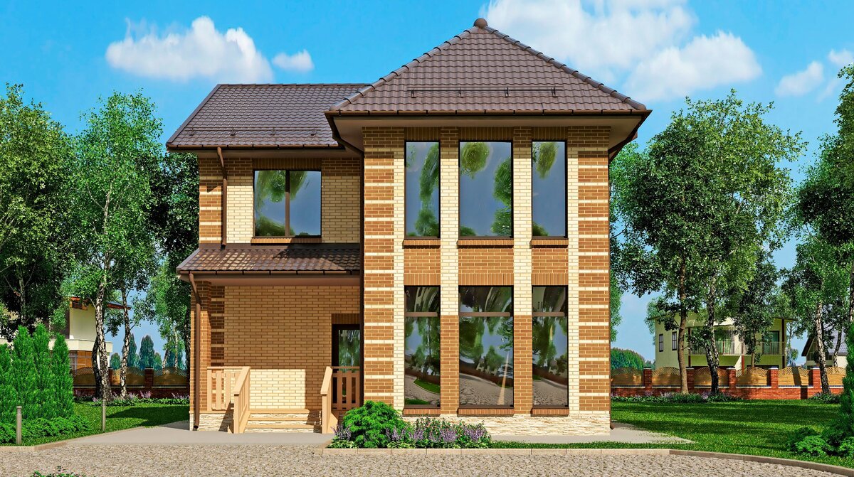 На фасаде распространённый микс жёлтого и коричневого кирпича.