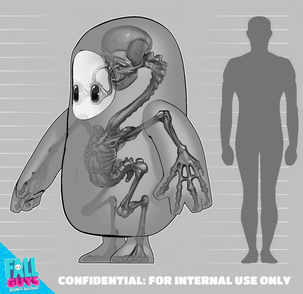 В официальном Twitter-аккаунте Fall Guys: Ultimate Knockout появились два довольно жутких изображения. Авторы решили раскрыть рост героя игры и его анатомию.