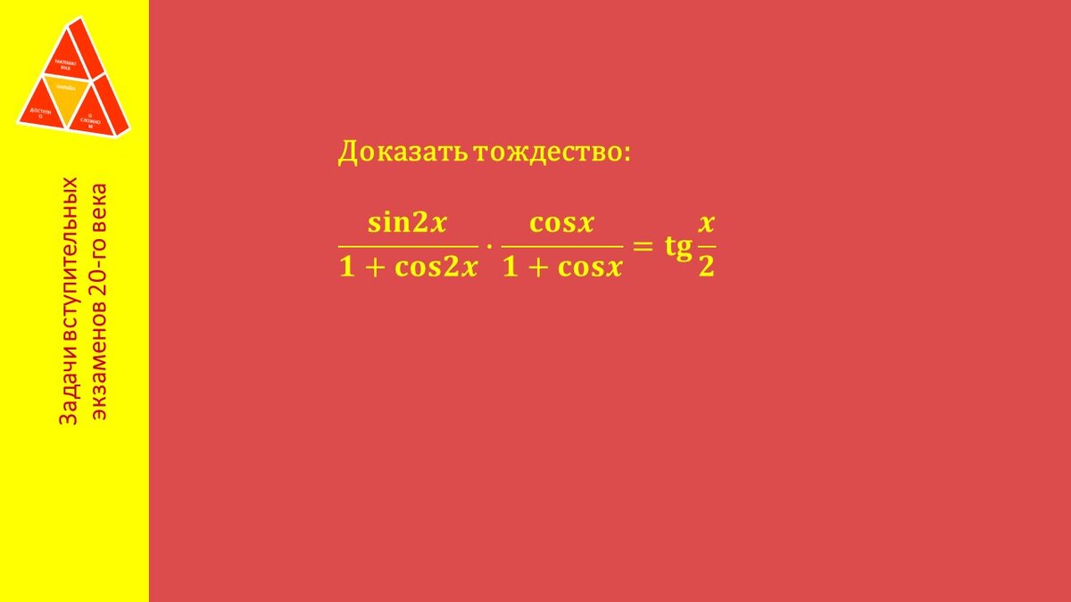 Математика онлайн. Доступно о сложном Здравствуйте, уважаемые любители математики! Можно заметить, что в равенстве присутствуют аргументы x, 2x и x/2. Для упрощения сначала перейдем в левой части к аргументу x. Тождество пока не доказано. Продолжим преобразовывать левую часть, переходя к аргументу x/2. Все! Доказательство завершено. Если хотите потренироваться в преобразовании тригонометрических выражений, то попробуйте самостоятельно доказать следующее равенство: Решение - в самом конце статьи. Задания - из "Сборника конкурсных задач по математике" Говорова В.М. и др. Не забудьте подписаться на канал, если - Вам интересны вопросы, которые здесь разбираются; - Вам могут потребоваться консультации по математике (подробнее здесь). Все статьи серии "Задачи вступительных экзаменов 20-го века" Рубрикатор канала О канале Тесты по математике