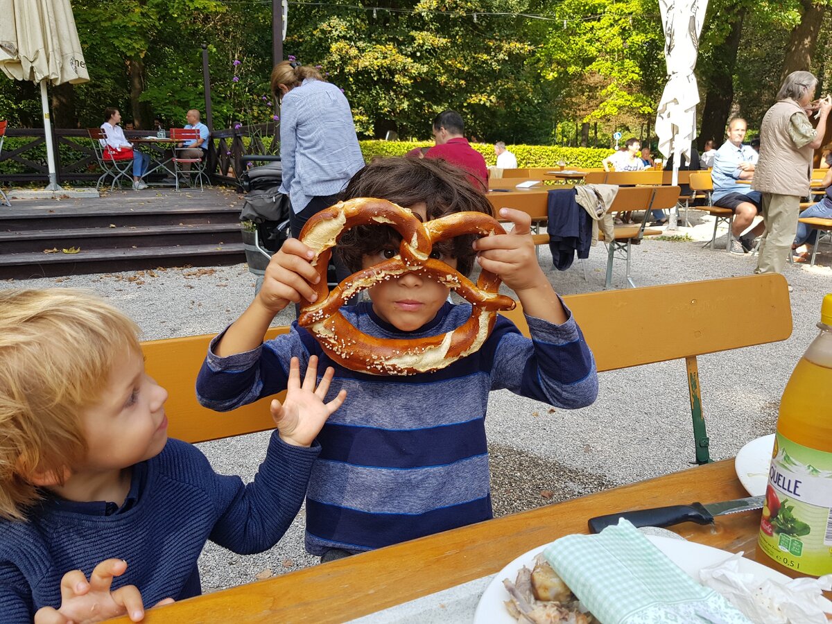 Младший долго "читал" меню, пока ему не принесли картошку, жаренную во фритюре. Средний выбрал крустенбратен с кноделем и капустой – хрустящее жаркое из свинины с картофельном шариком, величиной с апельсин. Старший внук Марино остановился на свиных колбасках с острым соусом и картофелем фри. Мне взяли курицу, хотя я ничего не заказывала, а хотела брецель, то есть красиво завернутый бублик посыпанный солью.