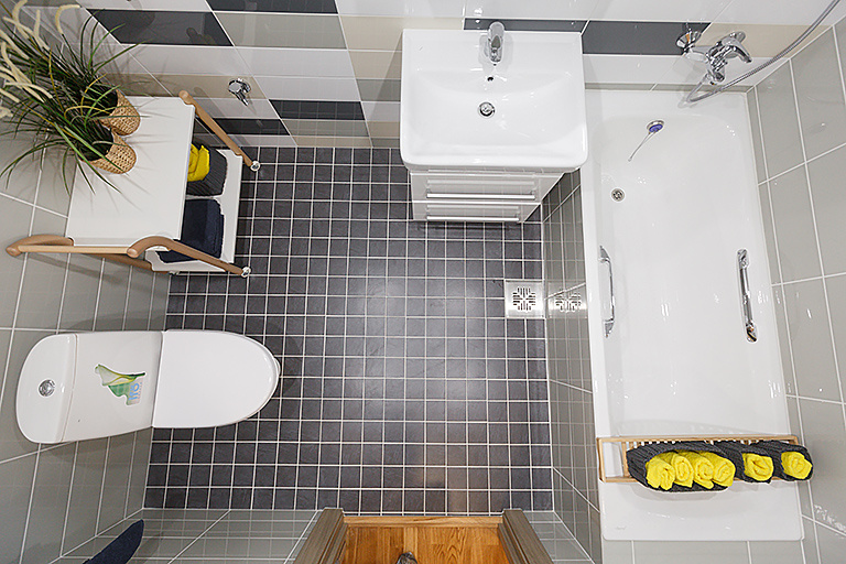 Ванна или душевая кабина, раковина, унитаз — традиционно самые массивные объекты. При выборе ванны помните, что в помещении должно оставаться хотя бы 50 см свободного пространства перед ней.