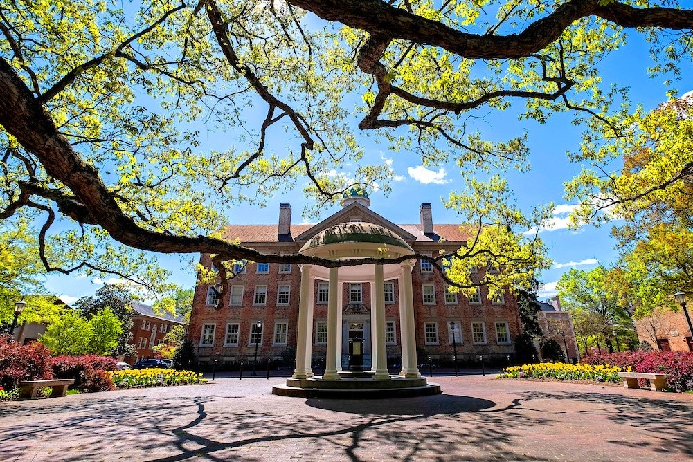 Старейший университет Северной Каролины, расположенный в городе Чапел Хилл, является государственным ВУЗом, главным среди кампусов штата, в составе которого несколько школ и колледжей: В школе обучается около 29000 студентов, из них 18000 — на бакалавриате, 11000 — на магистратуре и докторантуре. University of North Carolina славится не только высоким уровнем академического преподавания, но и исторической символикой университета, представленной архитектурными сооружениями (в частности Old Well, ротондой с фонтанчиком, построенной между двумя старейшими студенческими общежитиями). По легендарной традиции, студент-первокурсник должен попить воды из фонтанчика, чтобы успешно пройти 4 года учебы. Еще одним символом и своеобразным памятником является тополь, которому больше 300 лет: по легенде гибель тополя будет означать крах университета. ВУЗ также известен своей уникальной коллекцией книг, газет, журналов, изданных русскими сообществами по всему миру: кроме печатных изданий в составе к