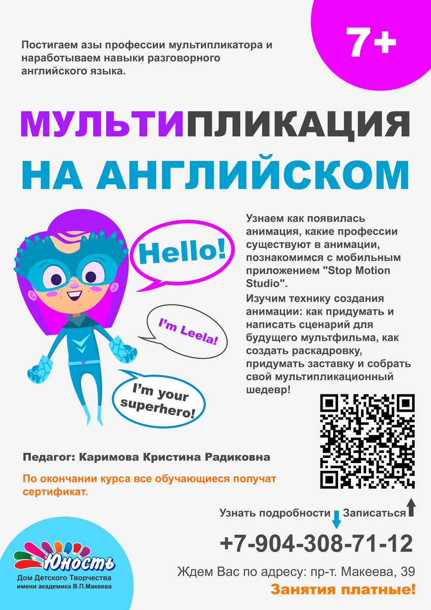 Объявляется набор на обучение по программе "Мультики на английском языке" (7+)