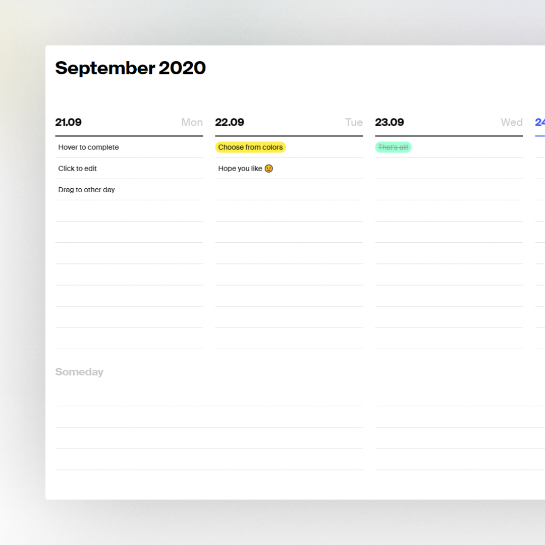 Простой и функциональный to-do-календарь частично повторяющий популярный trello. При первом знакомстве выкатывает лаконичный онбординг, который сразу показывает, как работает продукт. Также есть отдельное поле для задач «на потом», которое отображается постоянно.