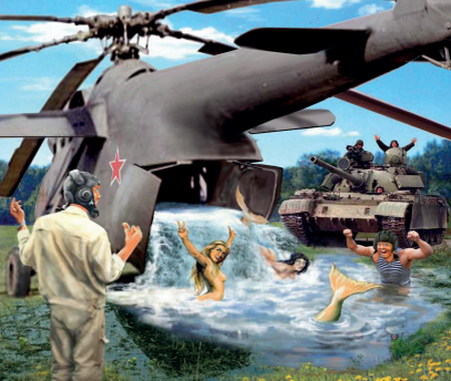 Танкисты с пониманием покивали головами, и, поочерёдно опробуя устройство, поУхали в него, как ухает филин по ночам. Экипаж делал титанические усилия, чтобы не разоржаться, наблюдая за экскурсоводом и слушая его интерпретацию назначения элементов конструкции машины. Дело в том, что чудо технической мысли с гофрированным шлангом было ничем иным, как… писсуаром, предназначенным для облегчения нужд экипажа в длительном полёте. Правда, использование его считалось на Ми-6 предосудительным, и, если уж кому-то приспичивало в полёте, то предпочитали использовать ведро, которое у хозяйственного бортмеханика всегда стояло на задних створках.
