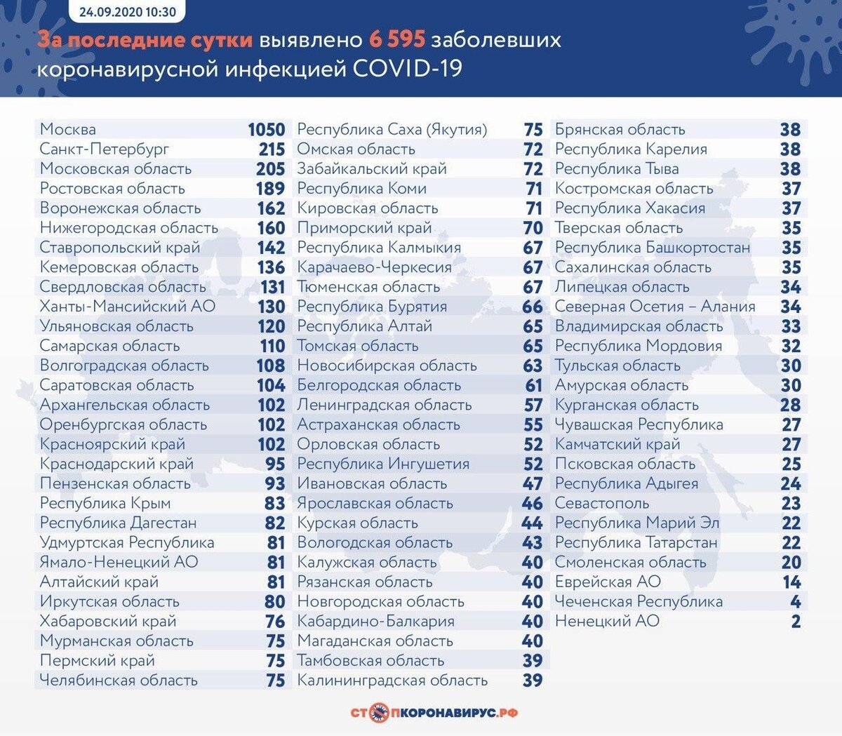 ⚡В России выявлено 6 595 новых случаев коронавируса