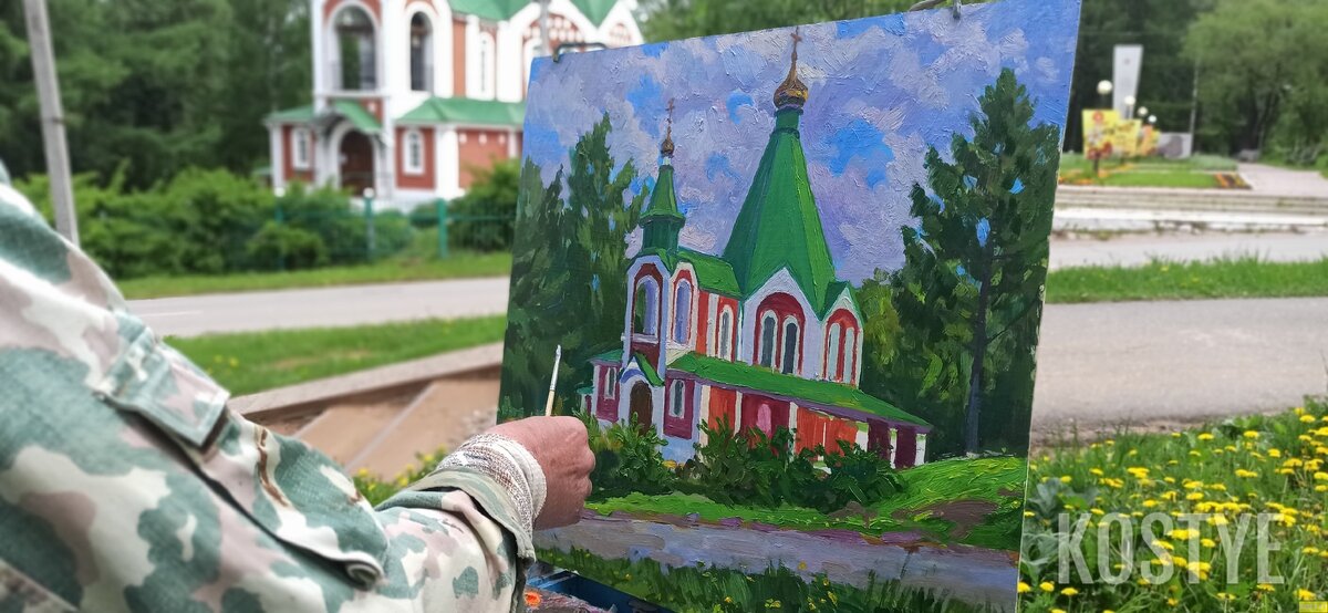 Но не только покупками едиными, как говорится. Проходя в ТЦ, заметил дедушку, который на холсте вырисовывал нечто. Обернувшись, я увидел церквушку.