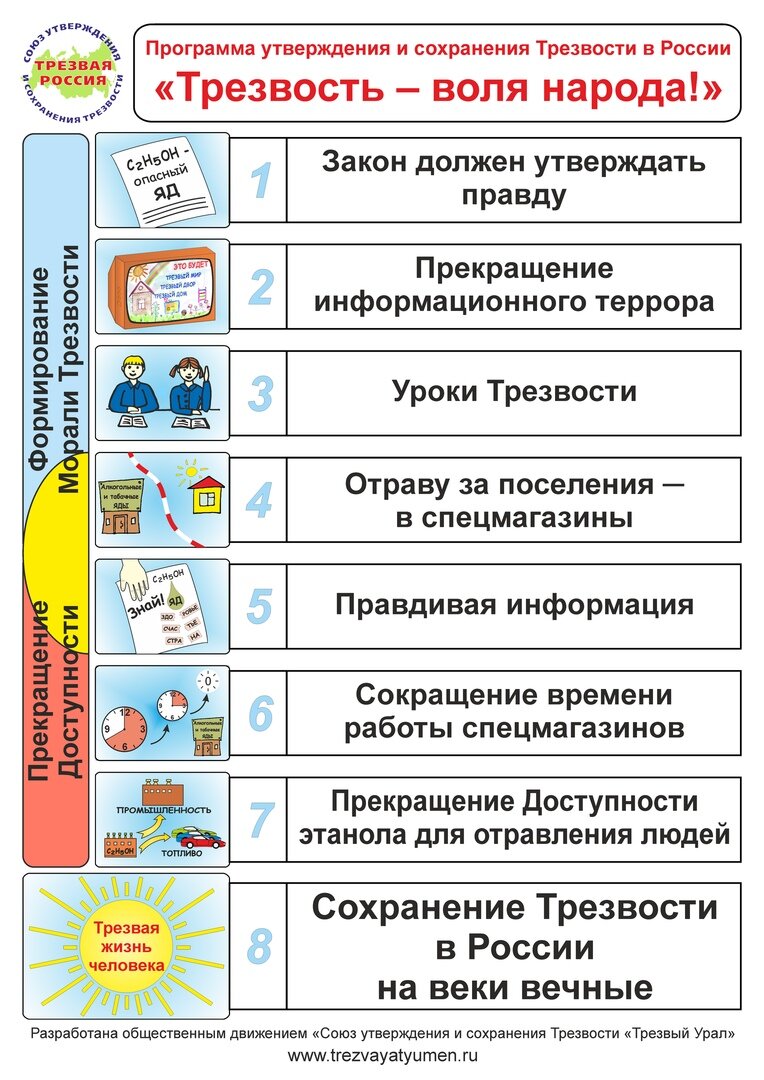 Это всего лишь маленькая выборка. Там, в программе, есть и то, что уже взято на карандаш властями, — например, запрет рекламы, «включая произведения искусства, в первую очередь художественные фильмы, песни». А ещё общественники предлагают ввести в обязательном порядке уроки трезвости во всех школах (учебники уже разработаны и написаны). Табак и алкоголь продавать исключительно в обезличенных и стандартных упаковках. В самих спецмагазинах, вынесенных к чёрту на кулички, кроме «интоксикантов» другого товара быть не должно. Но и этого мало. Процесс торговли пороком надо сопровождать мощной пропагандой трезвости: «В виде плакатов, баннеров, с использованием мультимедийных средств циркулярно выдаётся правдивая информация о действительных свойствах продаваемых интоксикантов и последствиях самоотравления ими».