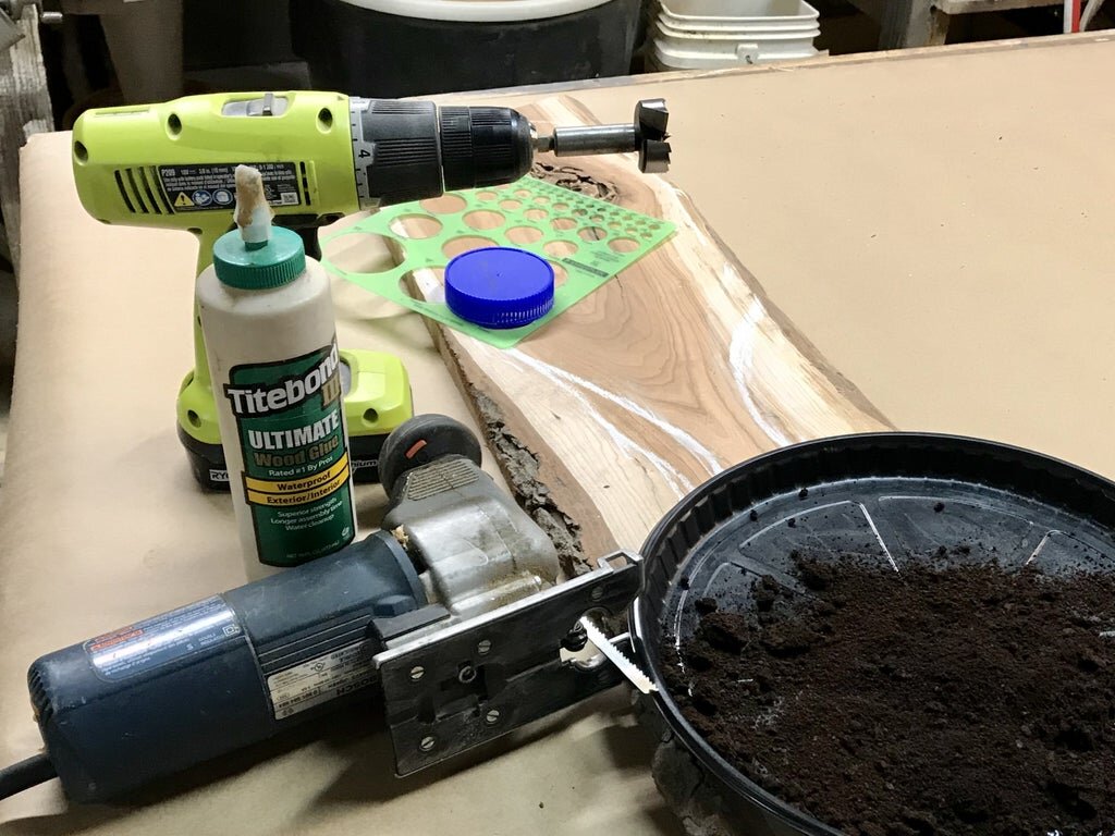 На доске используемой в проекте была сквозная трещина. Поэтому сначала необходимо было пропитать трещину клеем, а затем добавить слой кофейной гущи поверх клея.