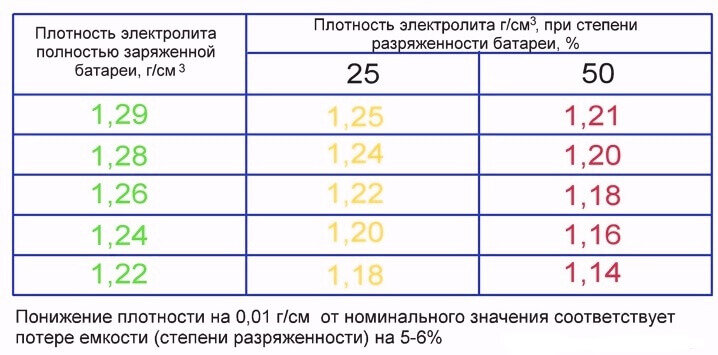 Особенность такого измерение является то, что плотность электролита в аккумуляторе зимой и летом в некоторых регионах будет разной в зависимости от сезона и среднесуточной температуры на улице. В таблице представлены данные на которые стоит ориентироваться.