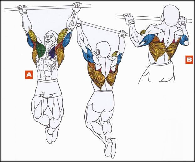 Подтягивания. Существуют разные варианты выполнения этого упражнения и использования различных хватов. Мы рассмотрим классический вариант с прямым хватом (ладони направлены от себя). Хват должен быть таким, чтобы ширина между кистями была чуть больше ширины плеч. Повиснув на турнике, глубоко вдыхаем, и на выдохе выполняем подъем вверх, приблизившись грудью к перекладине почти до касания. В верхней точке амплитуды пытаемся свести лопатки вместе. После этого плавно опускаемся на вдохе. Делаем необходимое количество повторений. Если вы можете сделать 12 и более чистых повторений с собственным весом, то стоит начать использовать дополнительное отягощение, которое можно закрепить за ремень на поясе. Техника упражнения от этого не изменится. Стоит только помнить о том, что важно выполнять подтягивания медленно, без резких движений, потому что это резко уменьшит их эффективность. Для того, чтобы выжать максимум пользы из подтягиваний, стоит соблюдать следующие правила: — Выполняем подтягивани