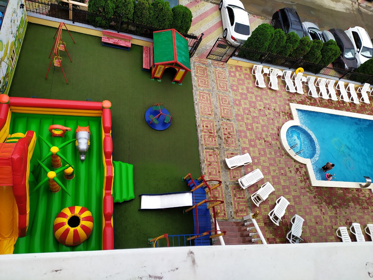 Всем привет. Хочу рассказать про наш отель в поселке Витязево (почти Анапа). Отель бронировала заранее из Москвы и переживала по этому поводу. Нужно было внести предоплату причем такая тонкость: если заказывать через Букинг то платишь 30 % предоплату, а если напрямую отелю (частному лицу) то 10. Но когда через Букинг делаешь заявку шустрые хозяева отеля сразу перезванивают и предлагают вносить предоплату им напрямую. Поэтому хоть вся стоимость нашего проживания и составляла 30 тыс рэ. но 10 %, т.е. 3000 руб терять не хотелось. А насчёт хозяина отеля было стрёмно мало что там за частное лицо. Приедешь потом на место и нет тебе ни отеля, ни лица. Но хозяин меня успокоил, что на следующий день придет на почту ваучер, который будет официальным документом при заселении. Короче я решилась. Перевела деньги. Хозяин (как сам сказал - грек в 5 поколении, но по мне так больше на армянина был похож). А когда ещё слышишь этот акцент по телефону... Ну вы понимаете... Тем не менее, он сразу перезвонил и все подтвердил. И через день мы поехали. На месте оказалось, что нас не обманули, но кое-что недоговорили про сырость во всем номере и темный цвет обоев. Типа так более стильно. Но на деле как в склепе. Все остальное было и на месте и нормально функционировало: довольно вместительный холодильник, душ без перебоев по воде, кондиционер, чайник, фен. Больше всего порадовала территория перед отелем: с заборчиком, бассейном, надувной игровой зоной и площадкой.
