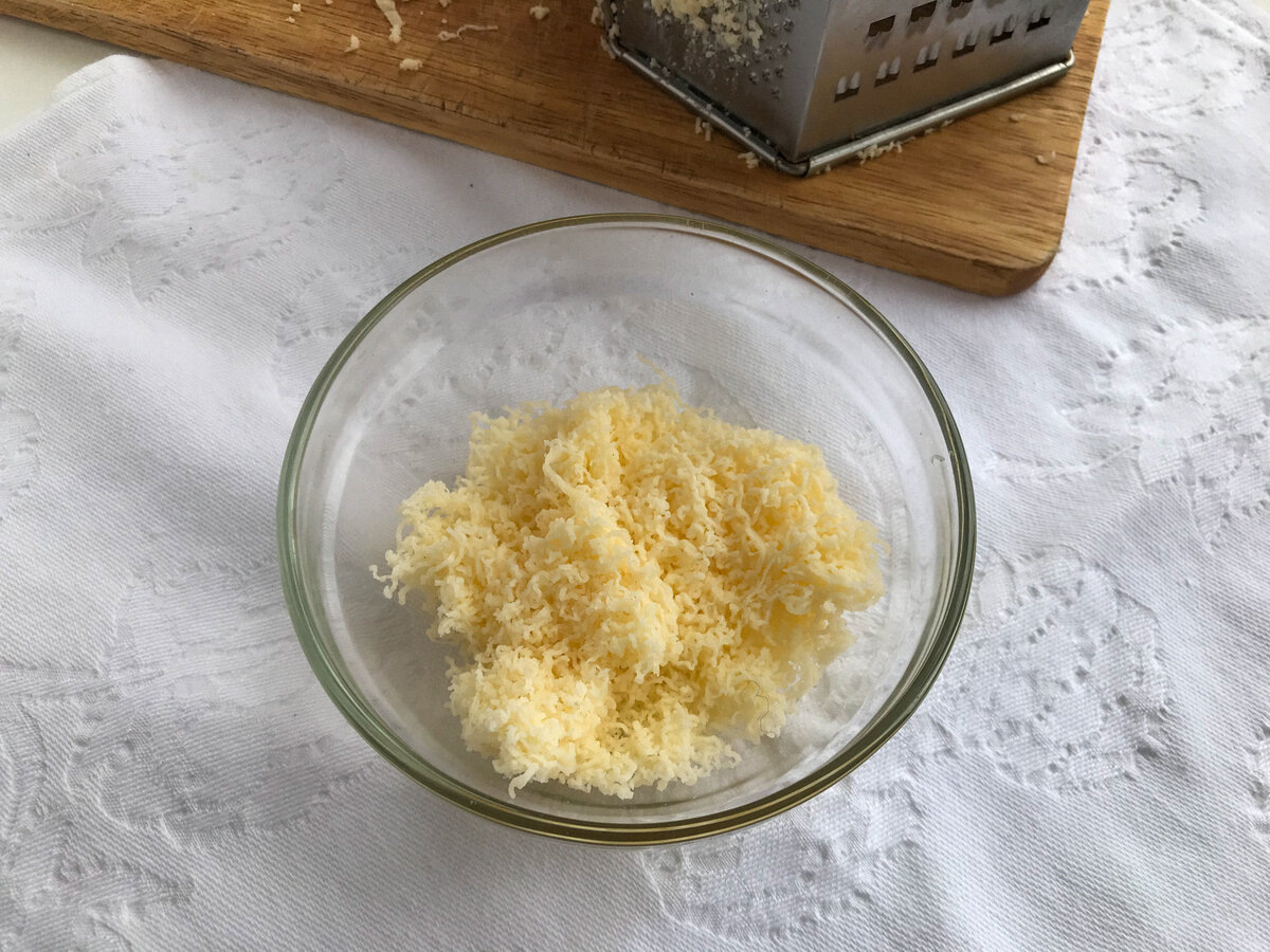 - Сыр (60 г.) натереть на самой мелкой терке, отложить в сторону.