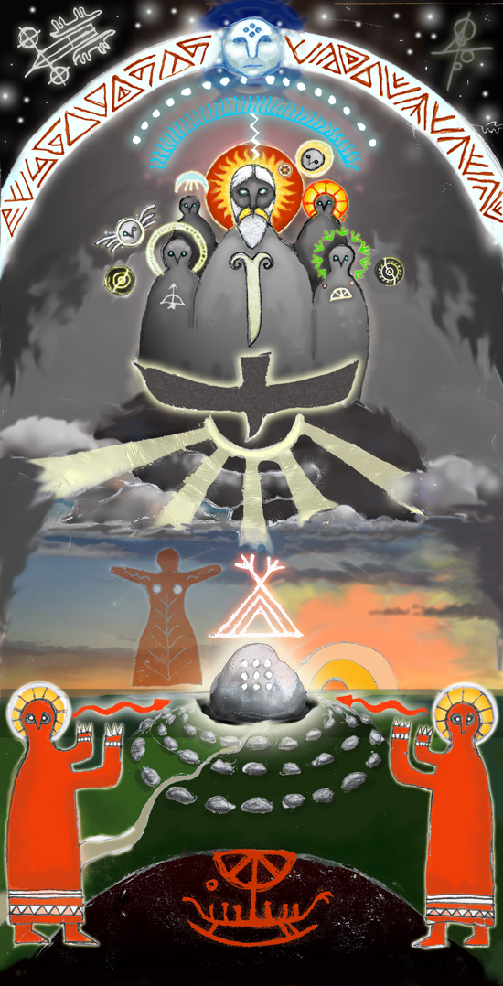 Когда Сварог ударял по Алатырю своим волшебным молотом, из искр рождались боги. На Алатыре был построен полуконем Китоврасом храм Всевышнего. Потому Алатырь - также алтарь, камень-жертвенник Всевышнему. На нем Всевышний Сам приносит в жертву Себя и обращается в камень Алатырь.