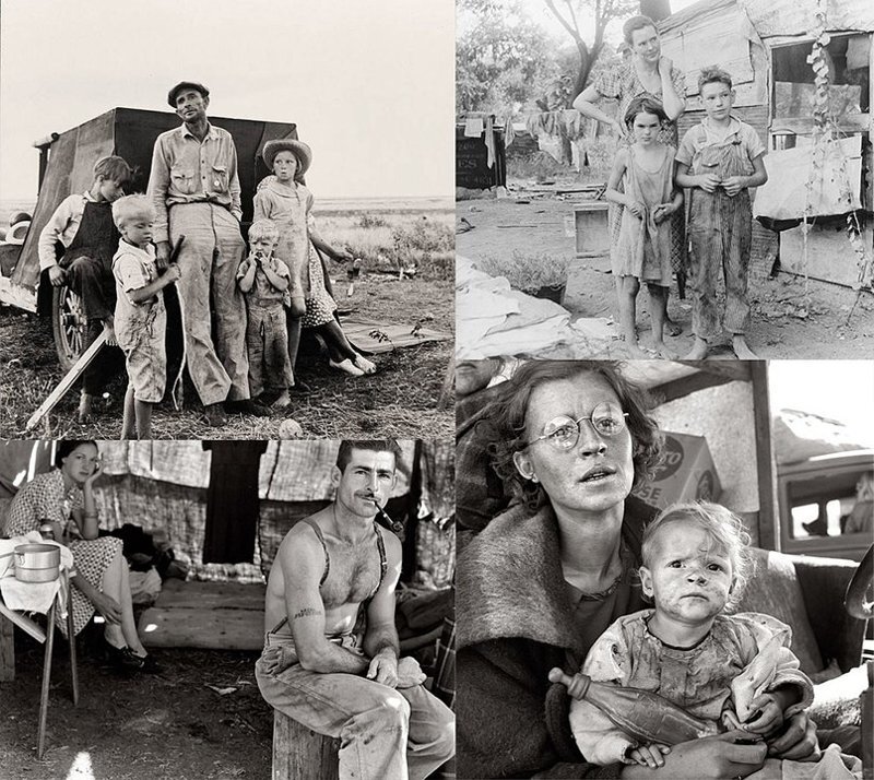 "...В полдень тракторист останавливался у фермерского домика и доставал завтрак: сандвич, завернутый в вощеную бумагу, – белый хлеб с маринованным огурцом, сыром и колбасой, кусок пирога, отштампованный, как машинная деталь. Он ел без удовольствия. А не выселенные еще арендаторы подходили посмотреть на него, с любопытством следили, как он снимает очки и резиновую маску, под которыми остались белые круги около глаз и большой белый круг около носа и рта. Выхлопная труба продолжала пофыркивать, потому что горючее стоило гроши, – какой смысл выключать мотор и каждый раз прогревать дизель? Любопытные дети толпились вокруг – оборванные дети, сжимающие в кулачках лепешки. Они следили голодными глазами, как тракторист разворачивает сандвич, принюхивались заострившимися от голода носиками к запаху огурцов, сыра, колбасы. Они не заговаривали с трактористом. Они провожали глазами его руку, подносившую пищу ко рту. Они не смотрели, как он жует; их глаза не отрывались от руки с сандвичем. А вскоре и арендатор, который не хотел покидать свой участок, подходил сюда и присаживался на корточки в тени трактора.