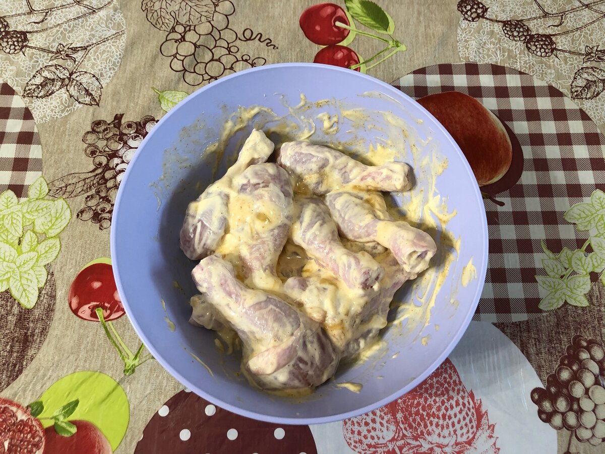 Маринуем куриные голени: добавляем к ним майонез, мед, специи, кроме соли. Оставляем в холодильнике на 2 часа.