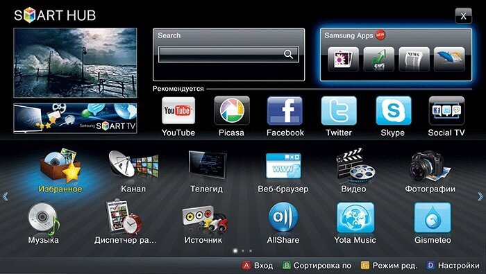 Взаимодействовать с программным обеспечением разработчики Samsung предлагают через раздел «Smart Hub», открывающийся через одноименную кнопку на пульте дистанционного управления – часто вместо надписи встречается своеобразный разноцветный ромб.