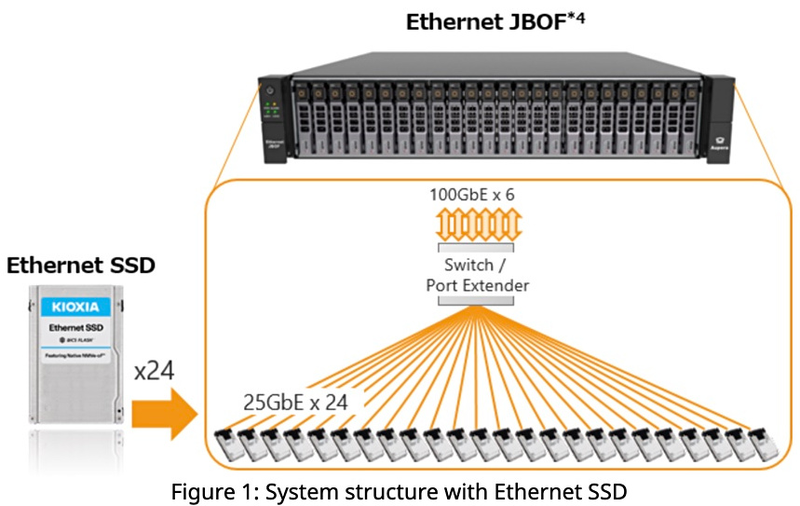 Как правило, даже платформа типа JBOF (Just a Bunch of Flash) достаточно сложна, поскольку такой системе помимо самих флеш-накопителей необходимы процессор, память, а также контроллер, отвечающий за интерфейс обмена данными с хост-системой. Подход Kioxia, который называется EBOF (Ethernet Bunch of Flash), обещает быть существенно проще в реализации, поскольку помимо самих накопителей требует только наличие коммутаторов Ethernet.