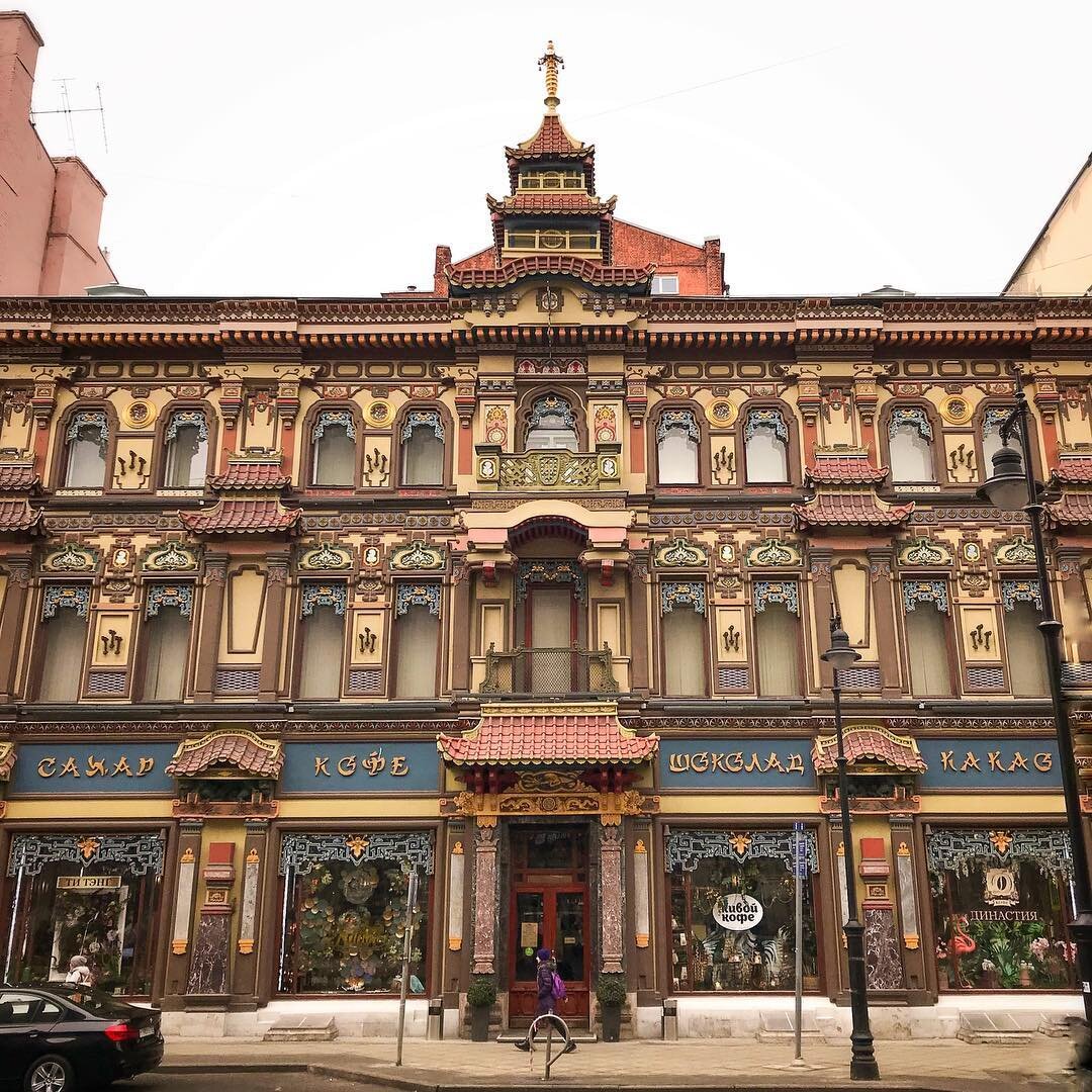 Чайный дом был возведен в стиле позднего Возрождения, а в 1896 году дом переоформили в китайском стиле. Над декором грандиозного трехэтажного здания работал Карл Гиппиус. Китайский стиль подчеркнули змейки, драконы, зонтики, традиционные восточные фонарики, орнамент, китайская черепичная крыша. Крышу здания увенчала двухъярусная пагода. Образ дома стал важным элементом имиджа и рекламы чайной компании Перлова. Внутри здания все тоже было выполнено в китайской стилистике. Даже жилую часть дома Сергей Перлов наполнил предметами из личной коллекции фарфора, уникальными шедеврами китайской живописи.