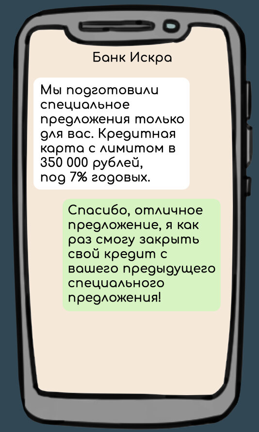 Всегда было интересно, если ты работаешь в банке, приходят ли тебе смс-предложения от банка-конкурента? Как в такой ситуации реагировать? В общем, я пофантазировал на эту тему, на мой взгляд ситуация выглядела бы так: