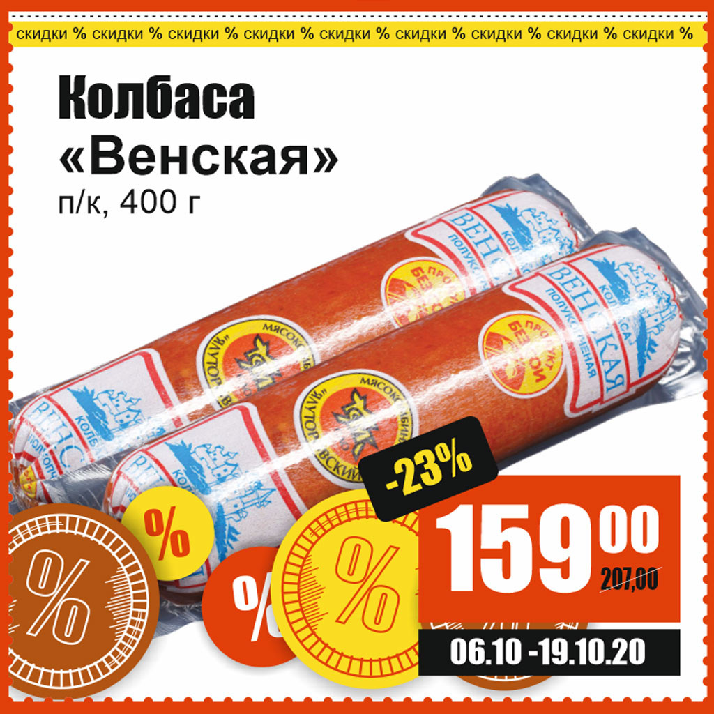 ✔ Колбаса полукопченая «Венская», 400 г. по цене 159 р. - скидка 23%, выгода 48 р.