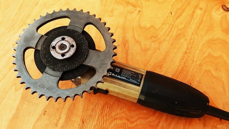 На картинке обычная ручная болгарка, но если установить на нее звезду, например от велосипеда, получится довольно мощный электропривод. А если