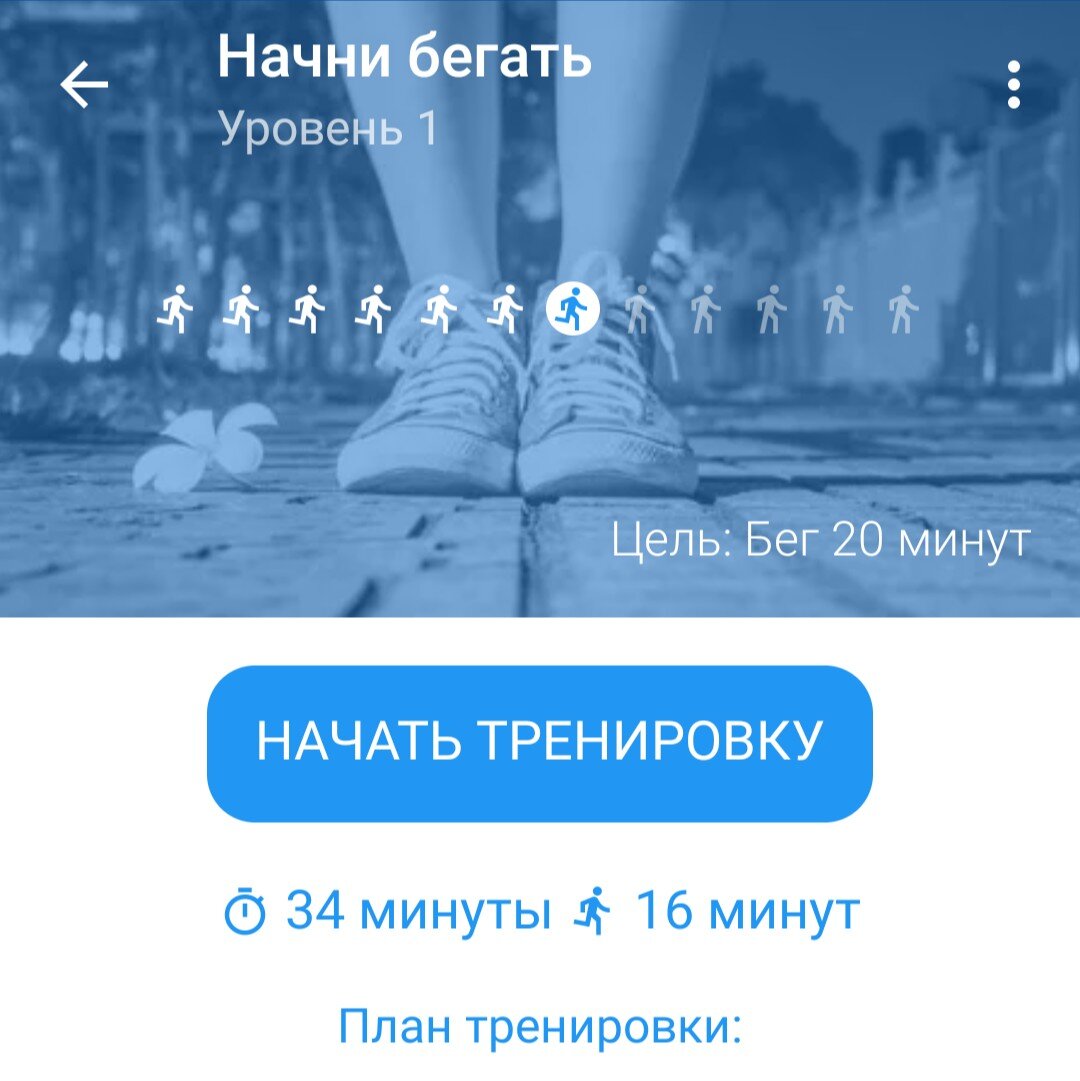 У меня есть план тренировки в приложении "Начни бегать". Слушайте, удобная штука для новичков. Ты вроде и бегаешь, но не всё отведенное время, половину пути идешь. Своего рода интервальная тренировка.