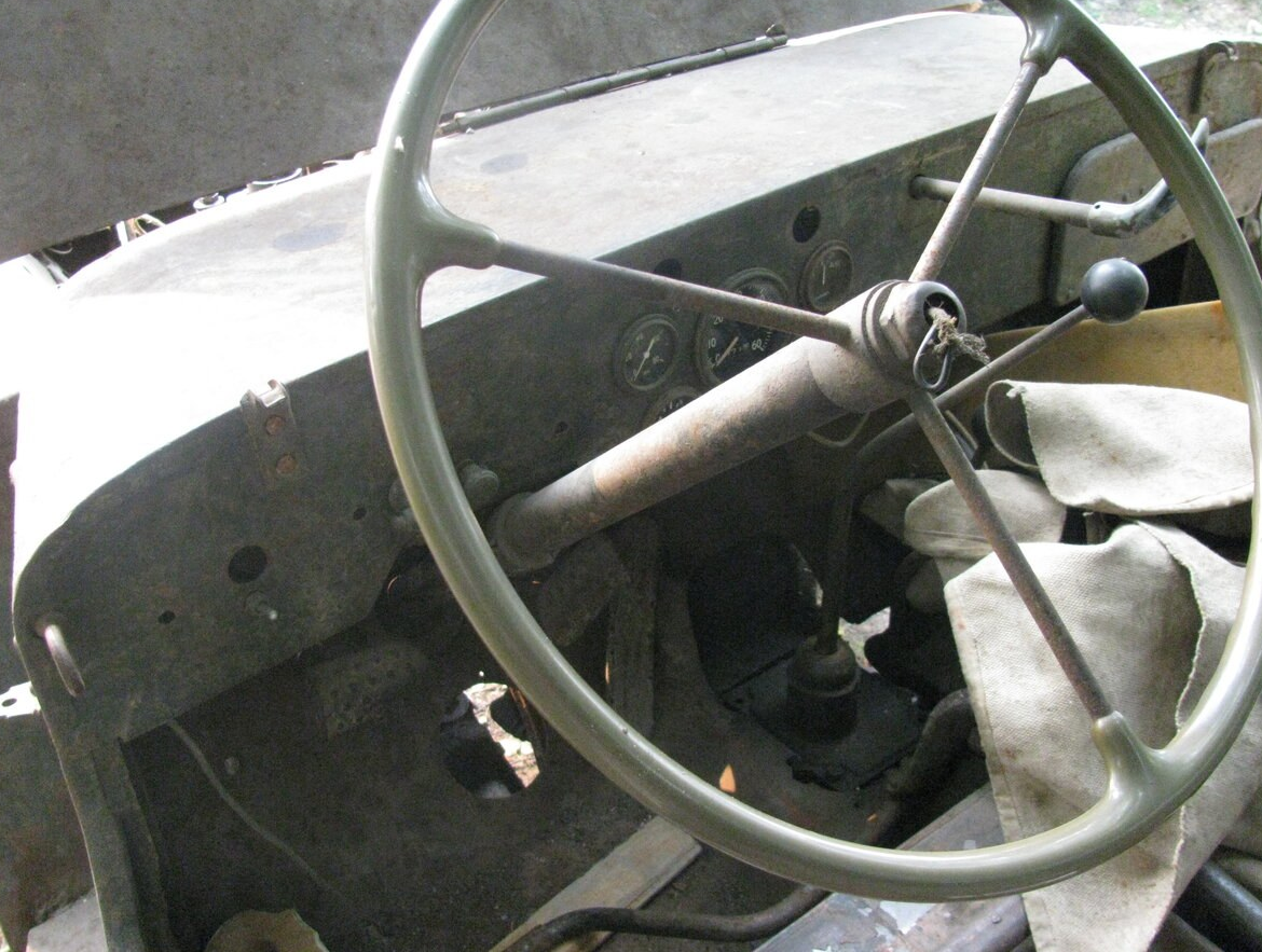 По фотографиям можно сделать вывод что машина практически полностью комплектна, хотя ее внешний вид и оставляет желать лучшего, у внедорожника сохранился родной 2.2 литровый двигатель, в свое время, такой выдавал не малые по тем временам 60 сил, панель приборов также, хоть и не полностью на сохранилась почти в полном оригинальном виде. Отдельного внимания заслуживает бензобак, который находится аккурат под креслом водителя, насколько такое решение безопасно трудно сказать, но инженерам разрабатывающие данный автомобиль видимо было виднее.
