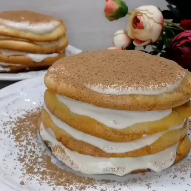 Смазываем лепешки кремом и кладём друг на друга. Убираем в холодильник на ночь для пропитки. Украшаем Какао.