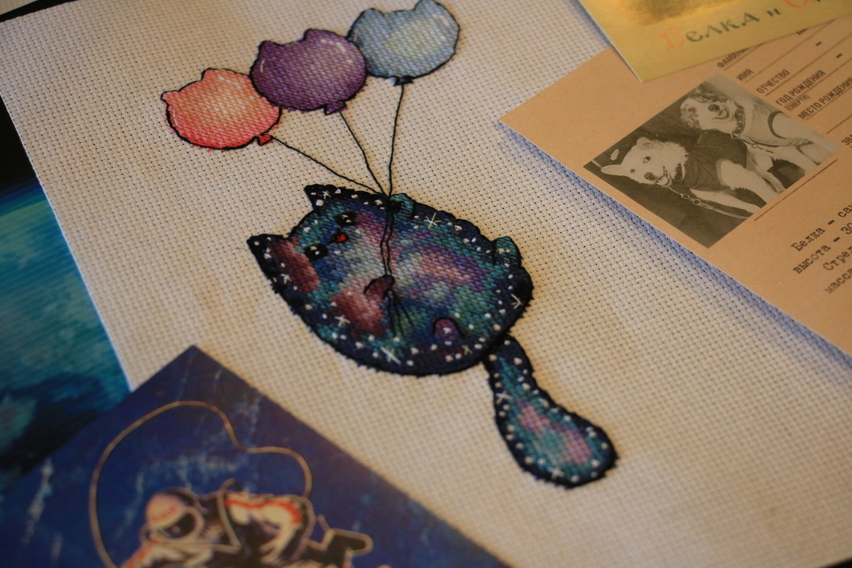 Первой схемой был вот такой космо котик с шариками, тоже в виде котиков. Получилось просто волшебно! Вышивала на аиде 18.