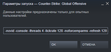 –novid -console -d3d9ex -threads 4 -tickrate 128 -noforcemparms -high +cl_updaterate 128 +cl_cmdrate 128 +ex_interpratio 1 +rate 128000.