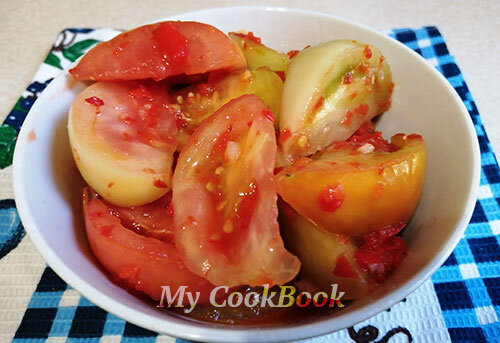 Оставляем на сутки в тёплом месте. Периодически (один раз в три/ четыре часа) перемешиваем помидоры для равномерного маринования. Готовую закуску раскладываем по банкам, закрываем крышками. Храним в холодильнике.