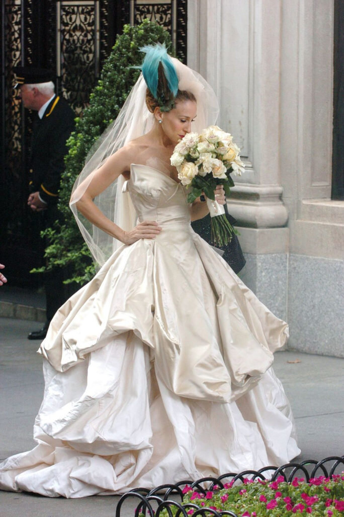Свадьбу Кэрри Брэдшоу и мистера Бига мы ждали на протяжении шести сезонов сериала «Секс в большом городе», так что с выбором свадебного платья Кэрри просто не могла ошибиться. Великолепное чувство стиля не изменило Кэрри и в день X: ее выбор пал на пышный наряд из атласа от Vivienne Westwood. Правда, в тот день они с Бигом так и не поженились и в итоге Кэрри сказала заветное «да» на скромной церемонии, одетая в лаконичный белый костюм. Но то самое свадебное платье мы вспоминаем до сих пор.
