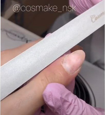 Наш технолог делает запил искусственного ногтя, нарощенного полигелем Cosmake. При этом используется сменный файл 180 грит под металлическую основу.