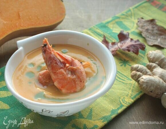 Осень — пора сытных супов, которые радуют не только желудок, но и глаз своими яркими красками! Один из таких ярких — и внешне, и по вкусовым качествам — супов я предлагаю вам попробовать. Деликатная пряность имбиря, сладость тыквы, вкус креветок и нотка зеленого соуса чатни — пусть эта осень будет вкусной и согревающей!