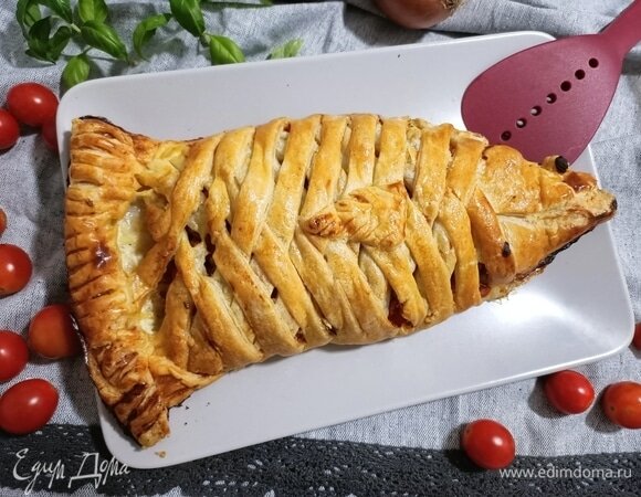 Далее с помощью ножа для пиццы на слоеном тесте делаем надрезы, начиная от верха начинки, на расстоянии 1 см.