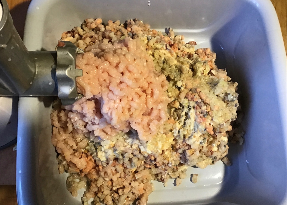Всю рыбу перекручиваю с луком и замоченным в молоке, отжатым хлебом на мясорубке. А потом добавляю ингредиент, который немного приглушит рыбный запах и сделает котлетки вкуснее. Это куриная грудка. Ее добавляю 1/3 часть от рыбного фарша.