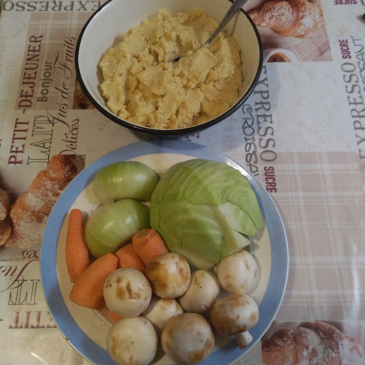 От семейного обеда у меня осталось картофельное пюре. Разогревать его несколько раз как самостоятельный гарнир не хотелось. И я решила приготовить из него котлеты, а вернее зразы с начинкой из капусты и шампиньонов.