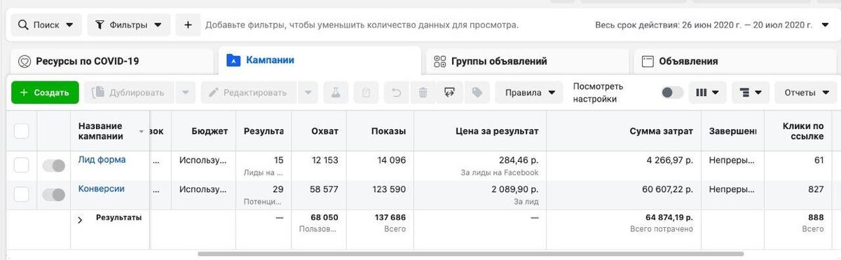 Всего на первый этап рекламной кампании, которая продолжался с 26 июня 2020 по 20 июля 2020, клиент потратил 64 874, 19 рублей. По результатам охват достиг 68 050 пользователей, количество показов всего — 137 686, клики по ссылке — 888.