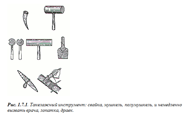 Они включают в себя изготовление огонов, сплеснем и матов, вязание узлов, постановку бензелей и мусингов, тренцевание и клетневание тросов, плетение матов и мягких кранцев, изготовление грузовых сеток и стропов и т.п. Выполняются указанные работы с помощью такелажного инструмента - сваек, драйков, лопаток, мушкелей, полумушкелей (рис. 1.7.1).