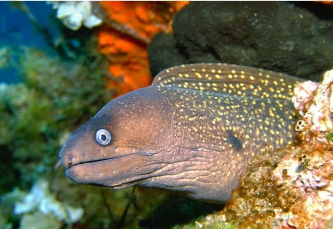Это крупная рыба с змееобразной формой тела. На вид она кажеться вполне безопасной, до того момента как вы с ней повидаетесь. Известны случаи немотивированного нападения на человека. Мурена считается одной из самых агрессивных рыб. Опасна она своим бесстрашием и острыми зубами. Обитает во всех теплых морях.