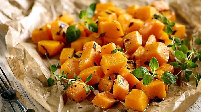 3. Тыква с картофелем. Слоями или вперемешку выложить нарубленную тыкву с сырым очищенным картофелем, пересыпая пряностями, травами. Тот самый случай, когда пригодится соль. Накрыть фольгой, запекать до готовности. За 10 минут до готовности можно присыпать сыром. Или полить майонезом :)